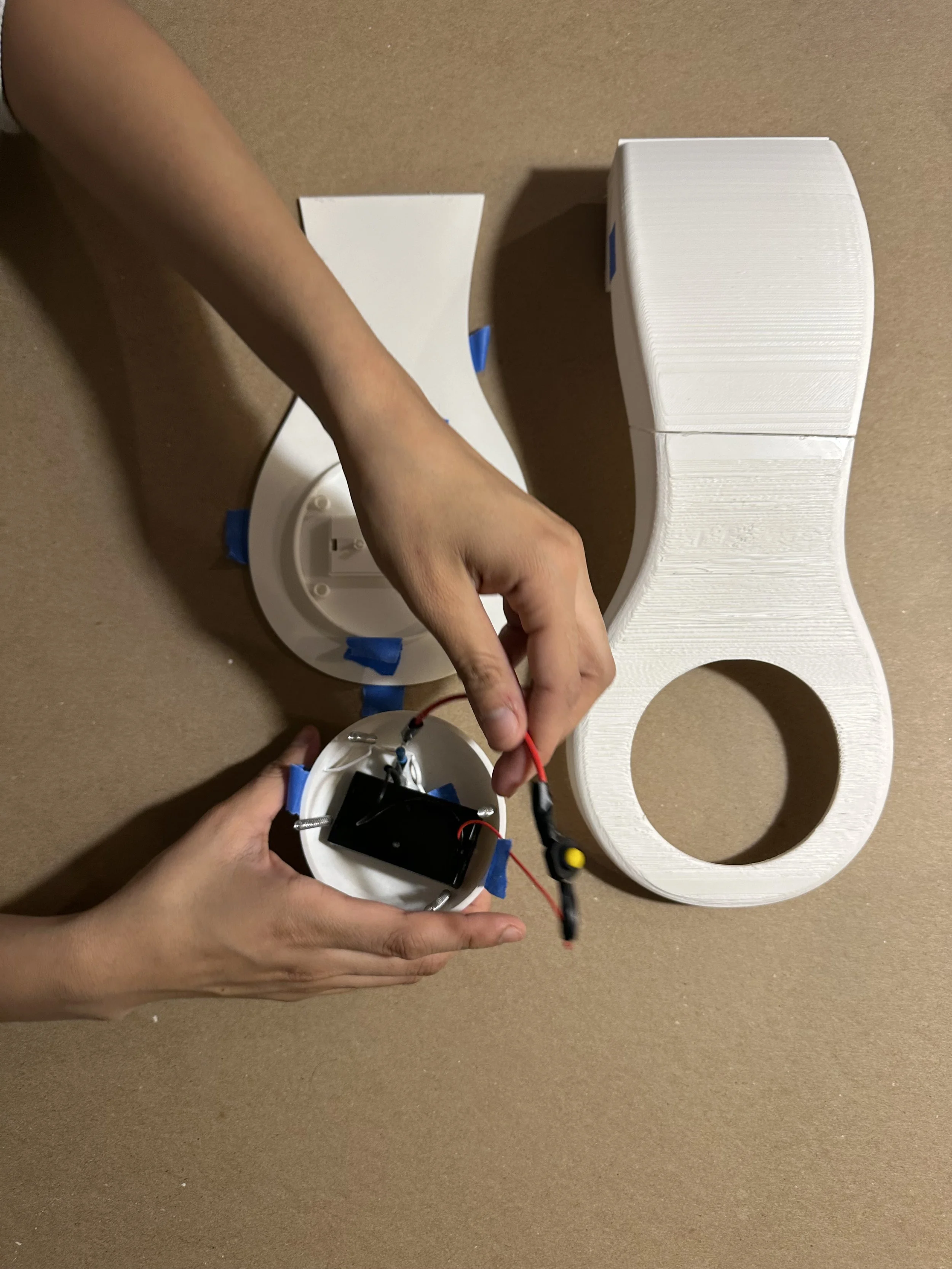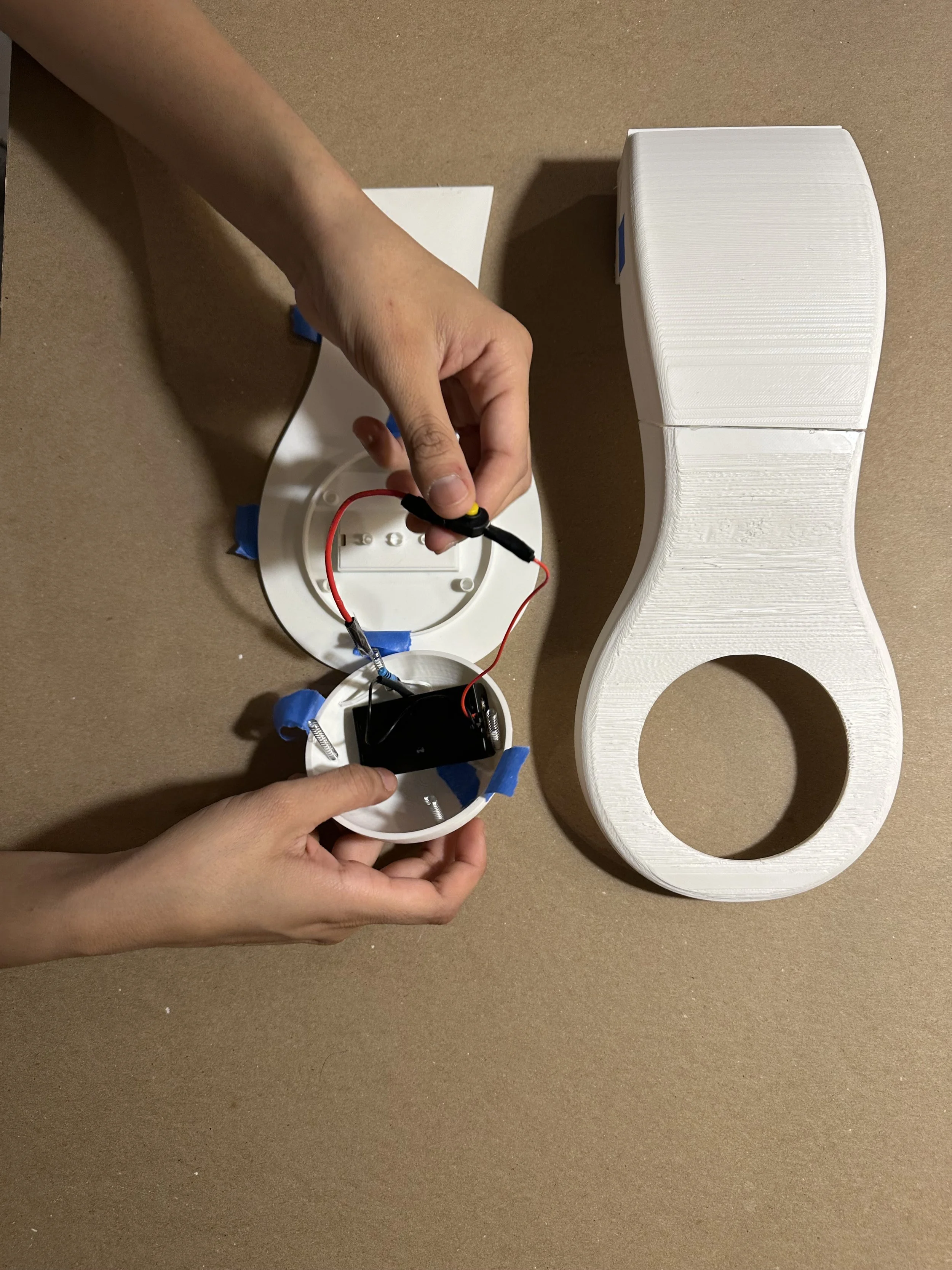 Working with the actual materials and securing the LED strip in place to begin testing the push button mechanism.